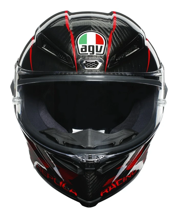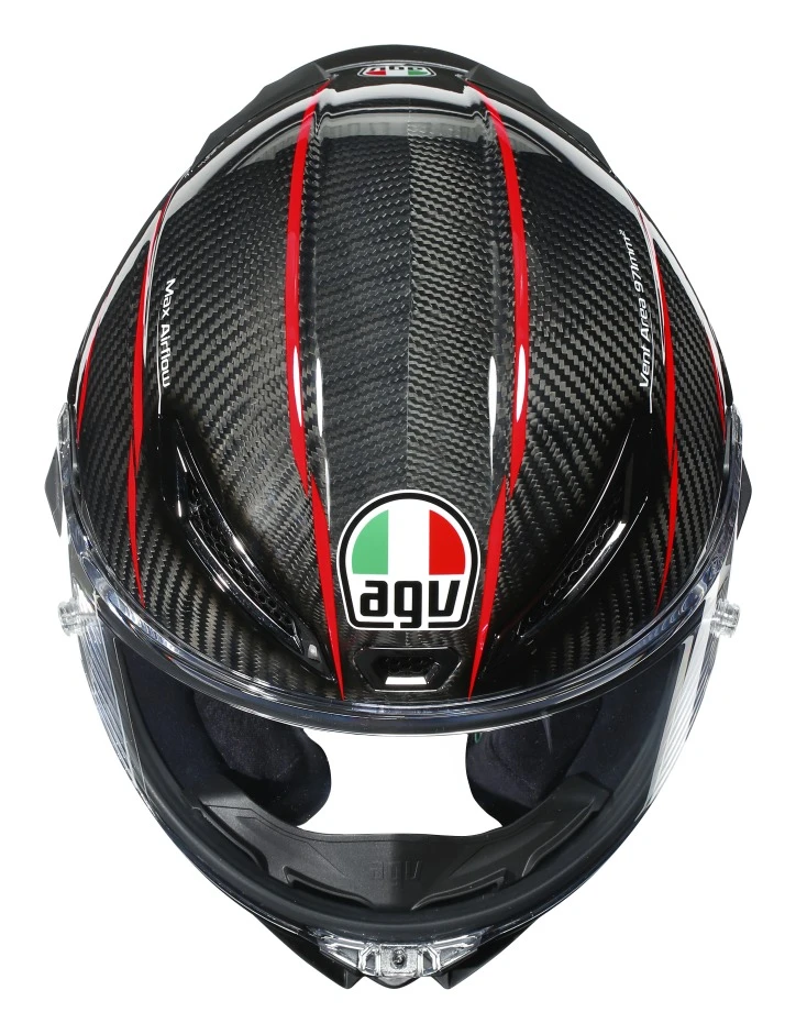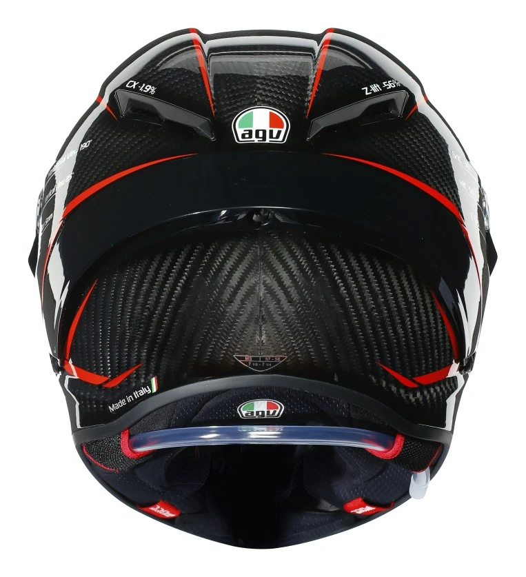 The AGV Pista GP RR Carbon Performance Helmet is an exact replica of helmets worn by world championship racers. It meets stringent FIM Racing Homologation standards and provides the highest level of protection, even against glancing impacts that can cause rotational motion. Carbon fiber molded into an innovative shape lets the helmet move through air effortlessly. AGV’s Integrated Ventilation System (IVS) uses 5 large front metal air vents and 2 rear extractors to let air pass through the helmet freely. Four shell sizes used across 7 different helmet sizes get a closer fitting shell compared to other helmets. The helmet was designed for an aggressive tucked racing position with a face shield allowing for a maximum vertical view and wide horizontal view. AGV’s patented Visor Lock System (VLS) decreases the chance that the face shield comes opens in a crash. With a fit developed for MotoGP racers, the Pista GP RR’s lining allows for an optimized fit and positioning on your head. Everything about the AGV Pista GP RR Carbon Performance Helmet is designed for high speed track performance.