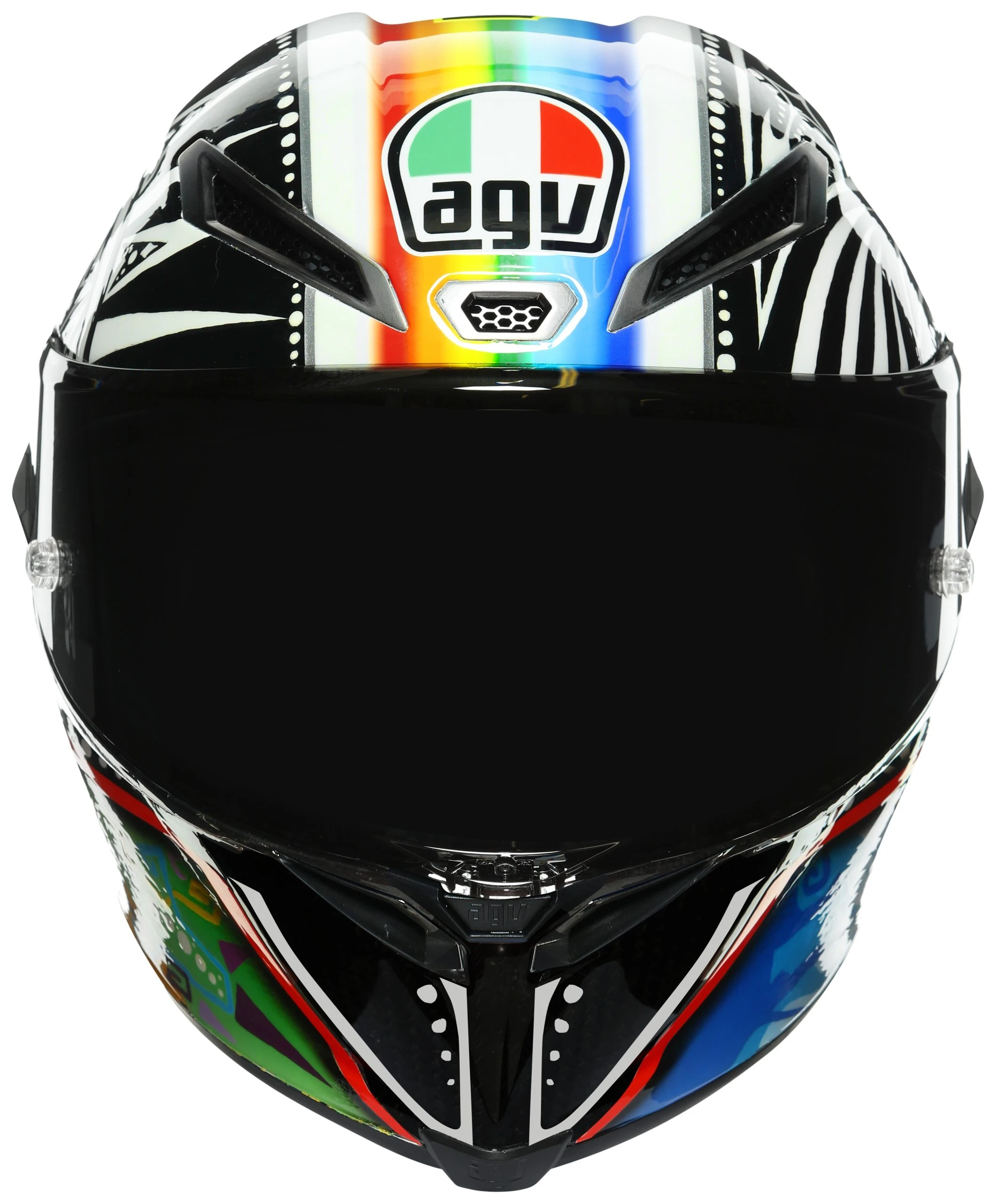 The AGV Pista GP RR Casci de Vale Helmet is an exact replica of helmets worn by world championship racers. It meets stringent FIM Racing Homologation standards and provides the highest level of protection, even against glancing impacts that can cause rotational motion. Forged carbon fiber molded into an innovative shape lets the helmet move through air effortlessly while also providing a different look compared to normal woven carbon fiber. AGV’s Integrated Ventilation System (IVS) uses 5 large front metal air vents and 2 rear extractors to let air pass through the helmet freely. Four shell sizes used across 7 different helmet sizes get a closer fitting shell compared to other helmets. The helmet was designed for an aggressive tucked racing position with a face shield allowing for a maximum vertical view and wide horizontal view. AGV’s patented Visor Lock System (VLS) decreases the chance that the face shield comes opens in a crash. With a fit developed for MotoGP racers, the Pista GP RR’s lining allows for an optimized fit and positioning on your head. Everything about the AGV Pista GP RR Carbon Performance Helmet is designed for high speed track performance.