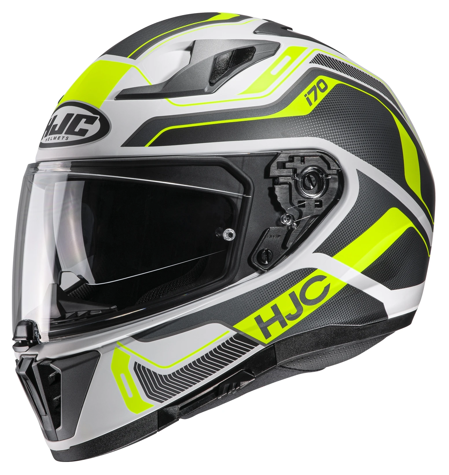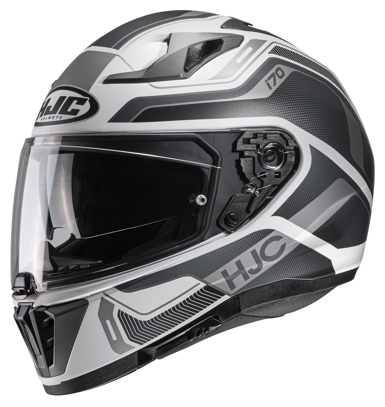 The i70 Lonex Helmet from HJC is a full-face, DOT approved, sport-tourer helmet with a 3-position inner sun shield. The HJ-31 face shield easily locks down at the center and swaps out quickly thanks to the RapidFire II system. The HJC i 70 Helmet lets you stay cool and dry with 7 intake vents and 2 exhaust vents at the spoiler. Compact and lightweight, the i70 provides an excellent fit.