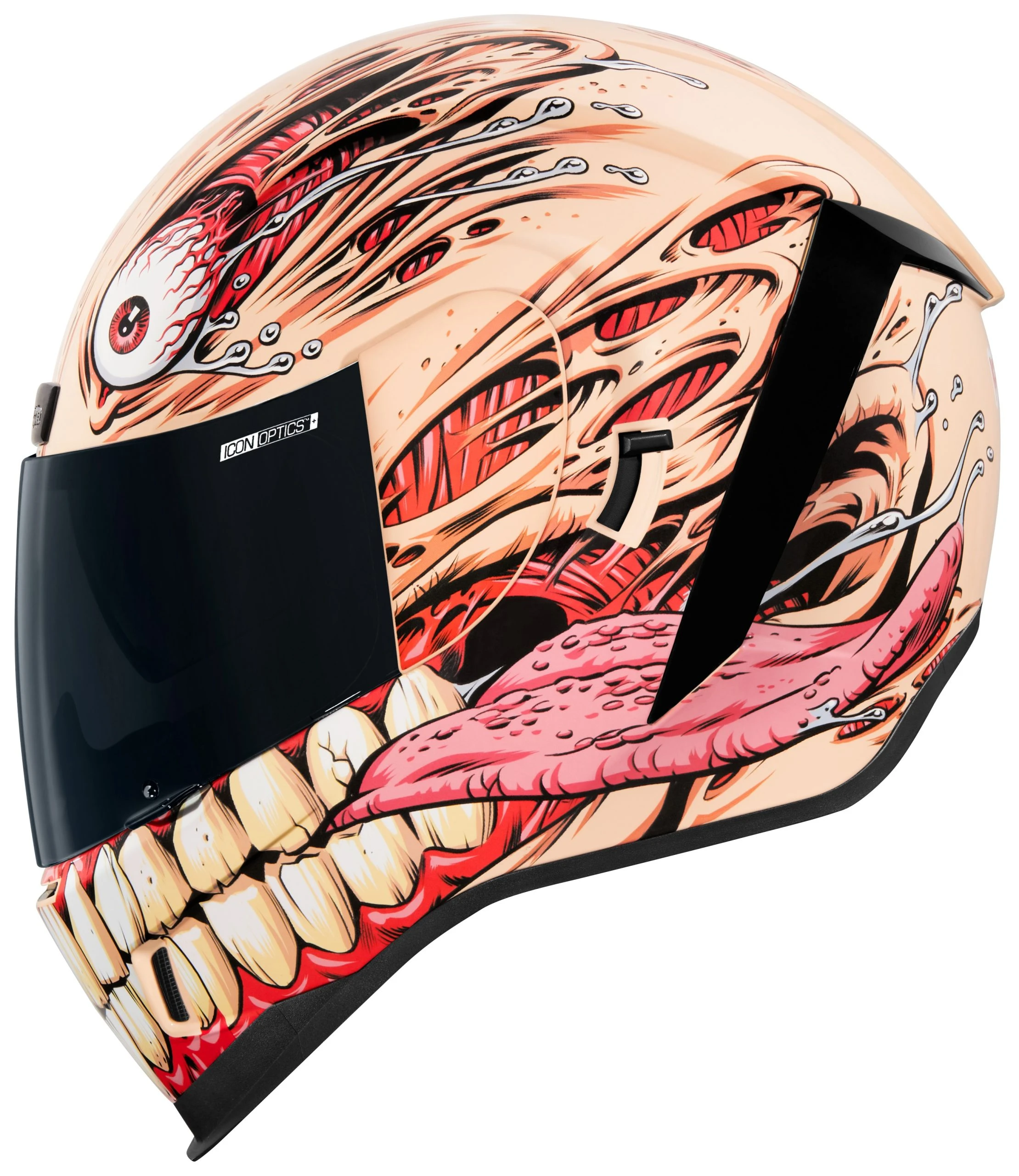Built for riders who need the accouterments of a touring helmet with the performance of a track helmet. When you want to have your cake and eat it too the Airform is a baker’s dozen of aggro-cupcakes. The Icon Airform Helmet pilfers the best ingredients from the performance oriented Airframe Pro and the feature rich Airflite. Icon then pats it, rolls it and marks it with a B before sliding it into an industrial oven for you and me. The result is an everyday helmet, if your everyday includes commuting to work in an aggressive riding posture or leisurely attacking apexes while on tour. Hold onto your buns, baker’s man.