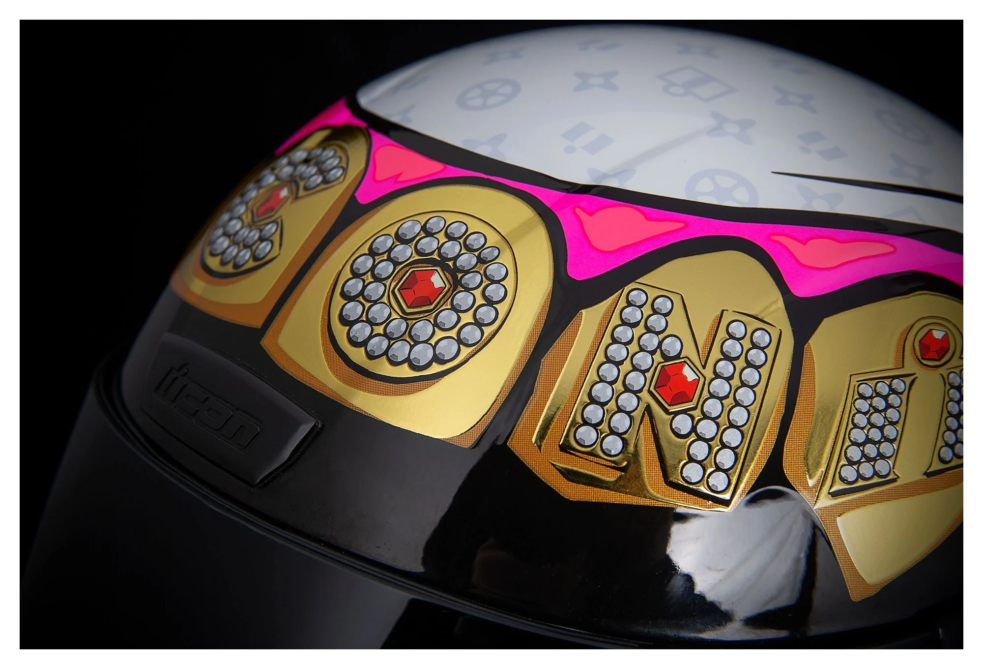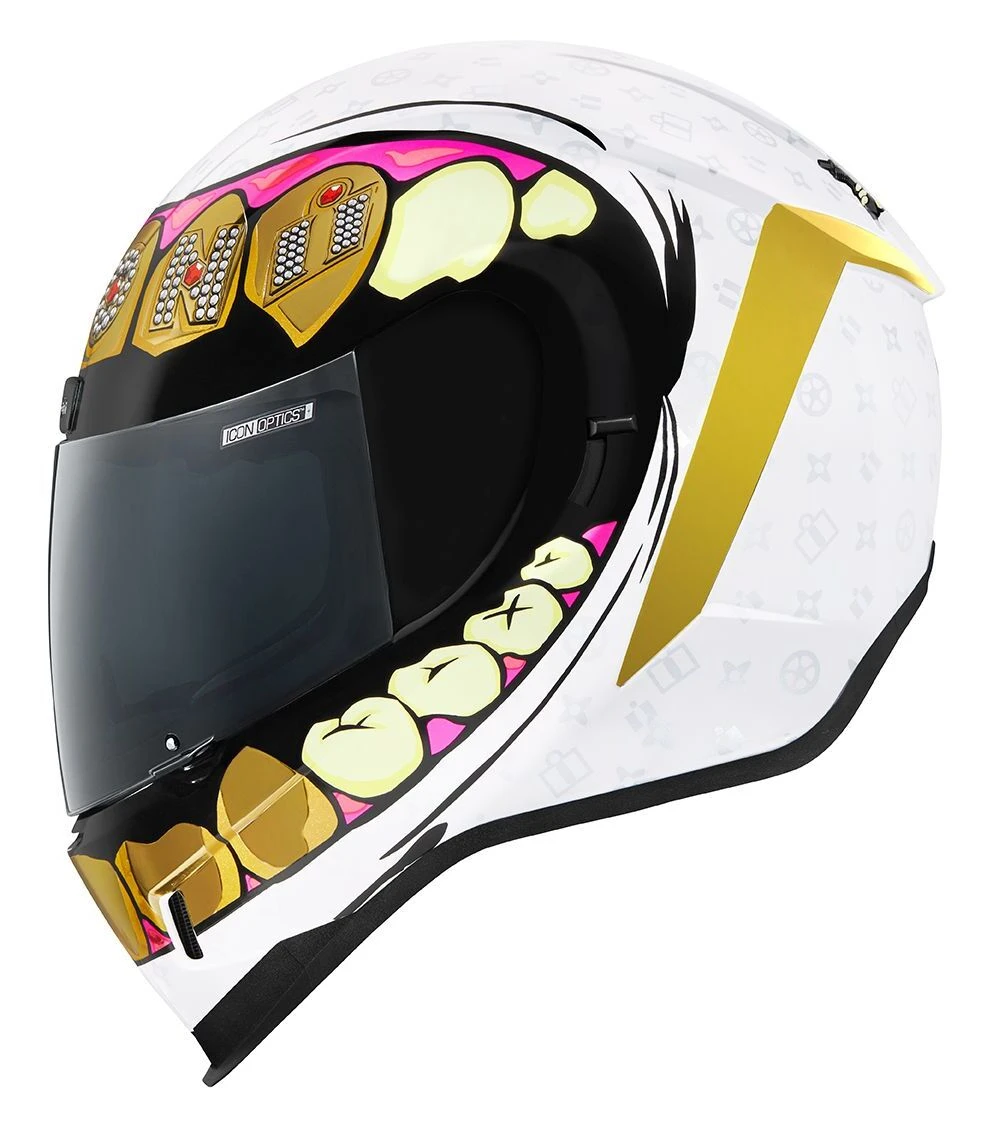The Grillz version of the Icon Airform includes a clear and dark smoke Icon Optics face shield. RST gold rear side spoilers arrive installed. The Grillz Helmet also has a unique 3D texture added to the jewel images.