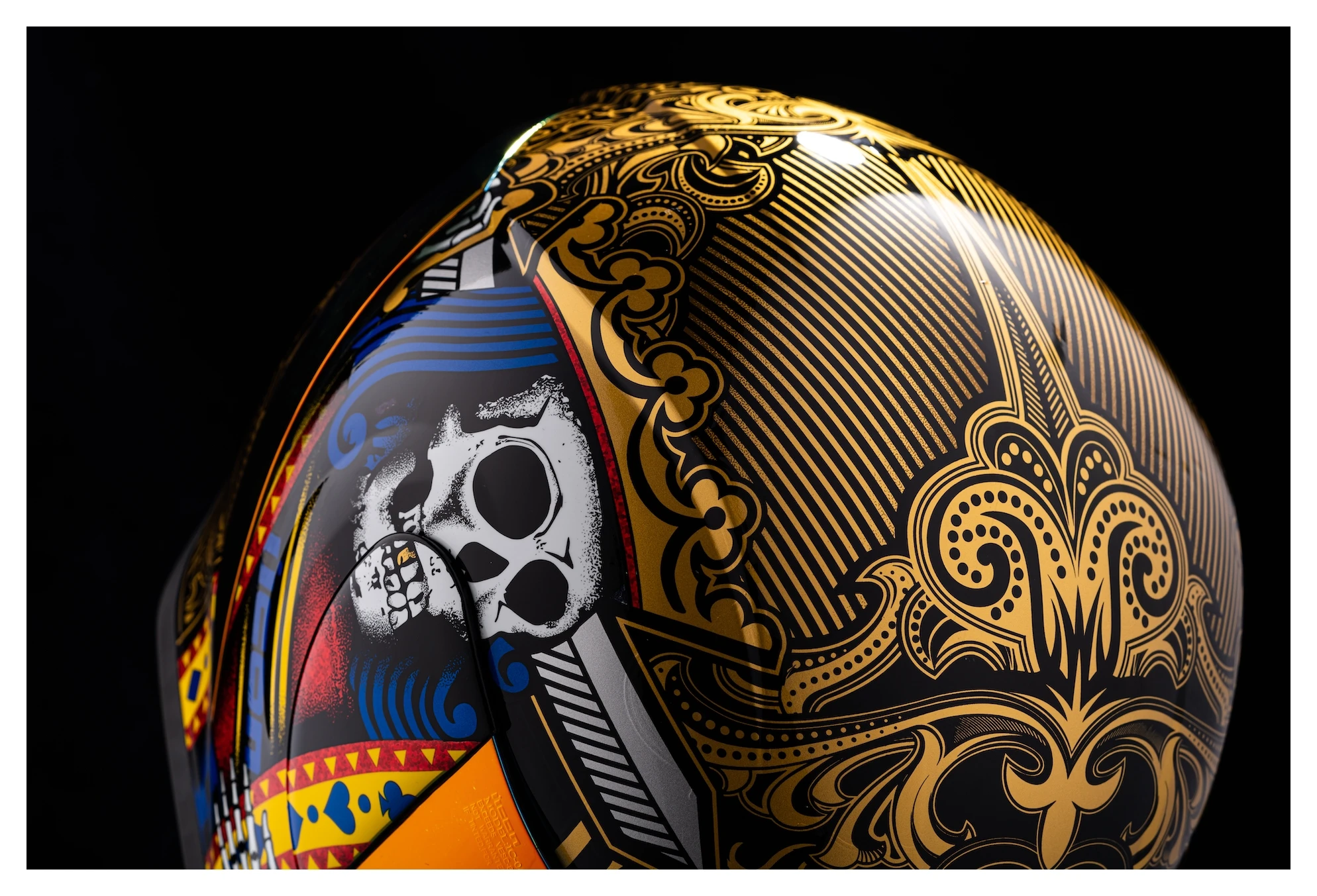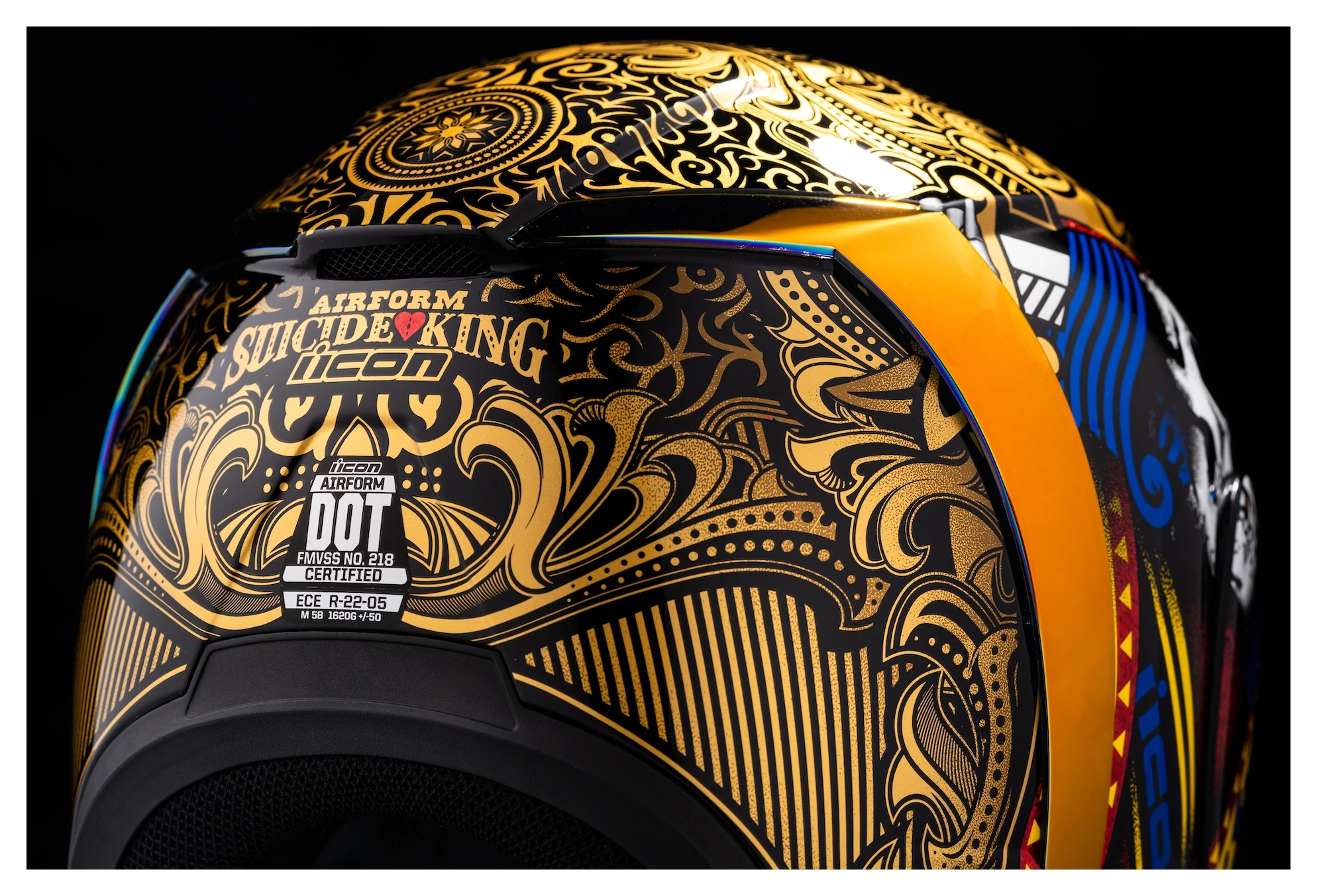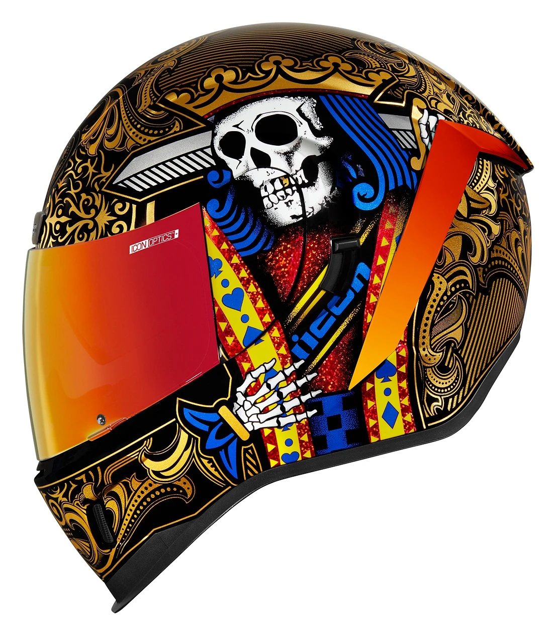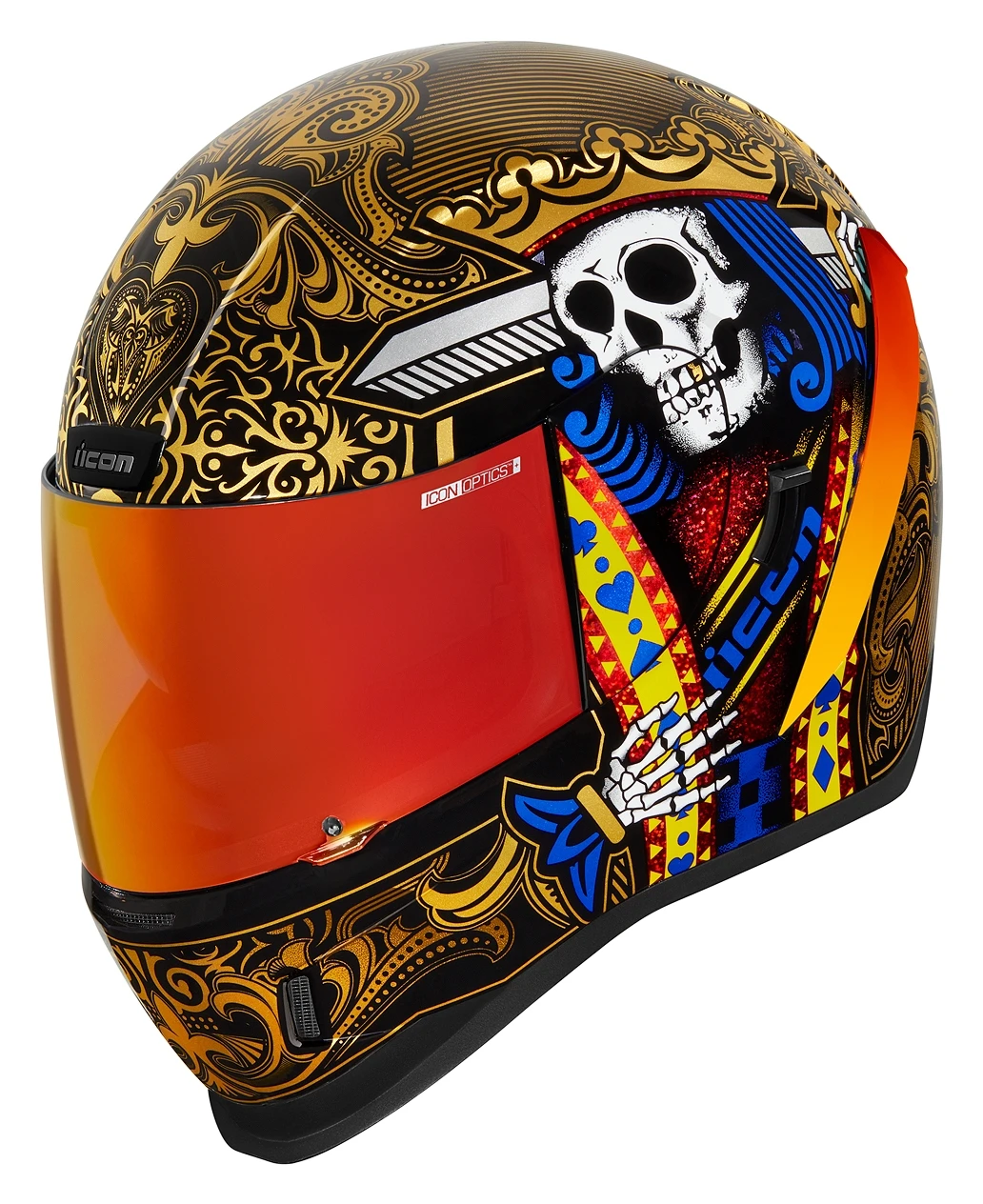 The only helmet that is down to crown, the Suicide King is resplendent in his red foil robes, blue curly locks and cranium slicing sword.