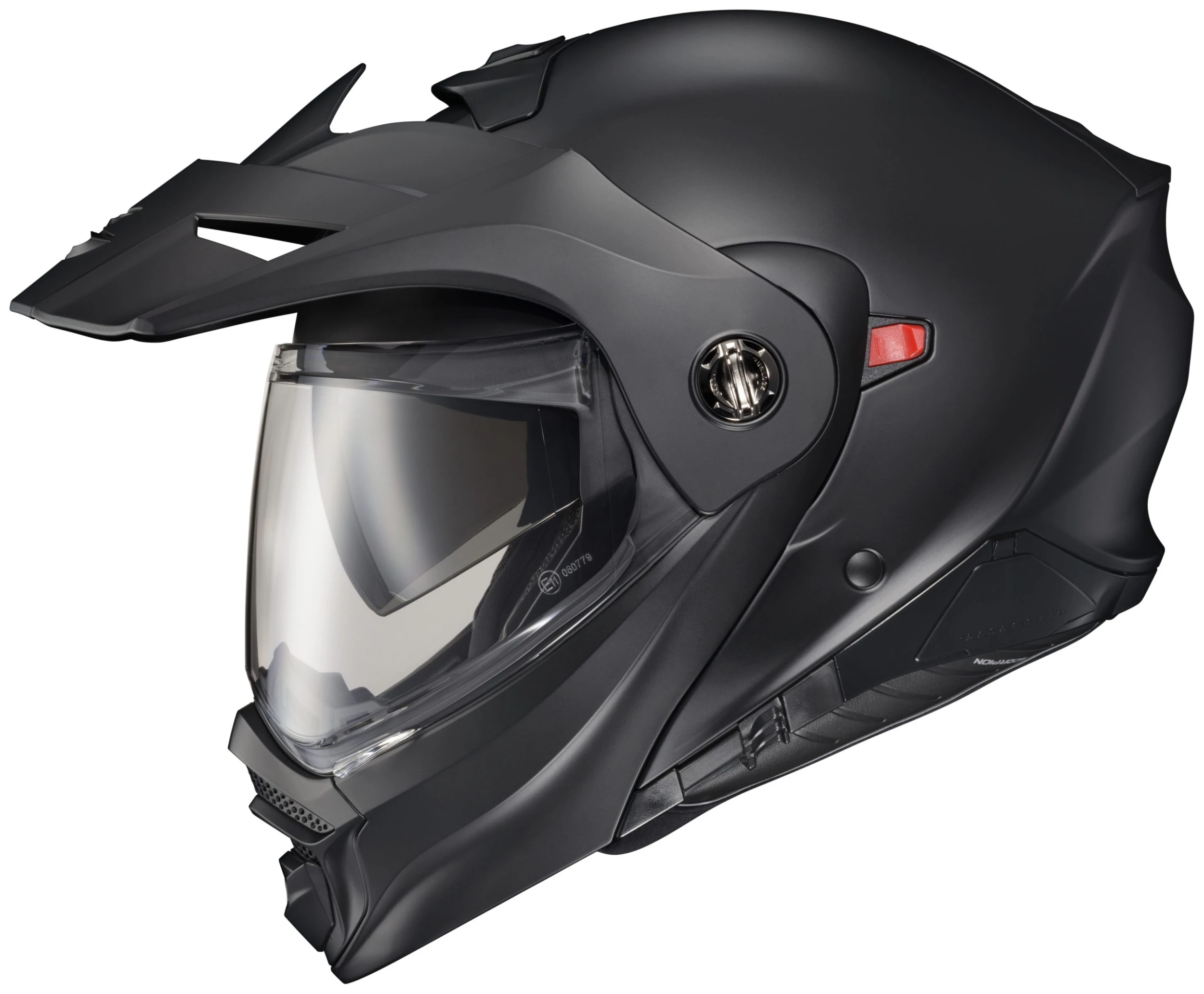 The Scorpion EXO-AT960 Modular Helmet has evolved from the super popular Scorpion EXO-AT950 Adventure Motorcycle helmet. The EXO-AT960 can be used as a full face ADV helmet with external peak visor attached, or the peak visor can be removed for a more aerodynamic touring helmet. An oversized eye port is extremely wide for greater peripheral vision and downward visibility, and the modular chin bar can be conveniently flipped up. The internal drop down Speedview sun-visor allows you to adjust to changing lighting conditions throughout the day. And for those who need to stay connected, the EXO-AT960 was specifically designed to integrate with the new EXO-COM BlueTooth Communicator Kit while the large speaker pockets also make it compatible with many other Bluetooth systems.