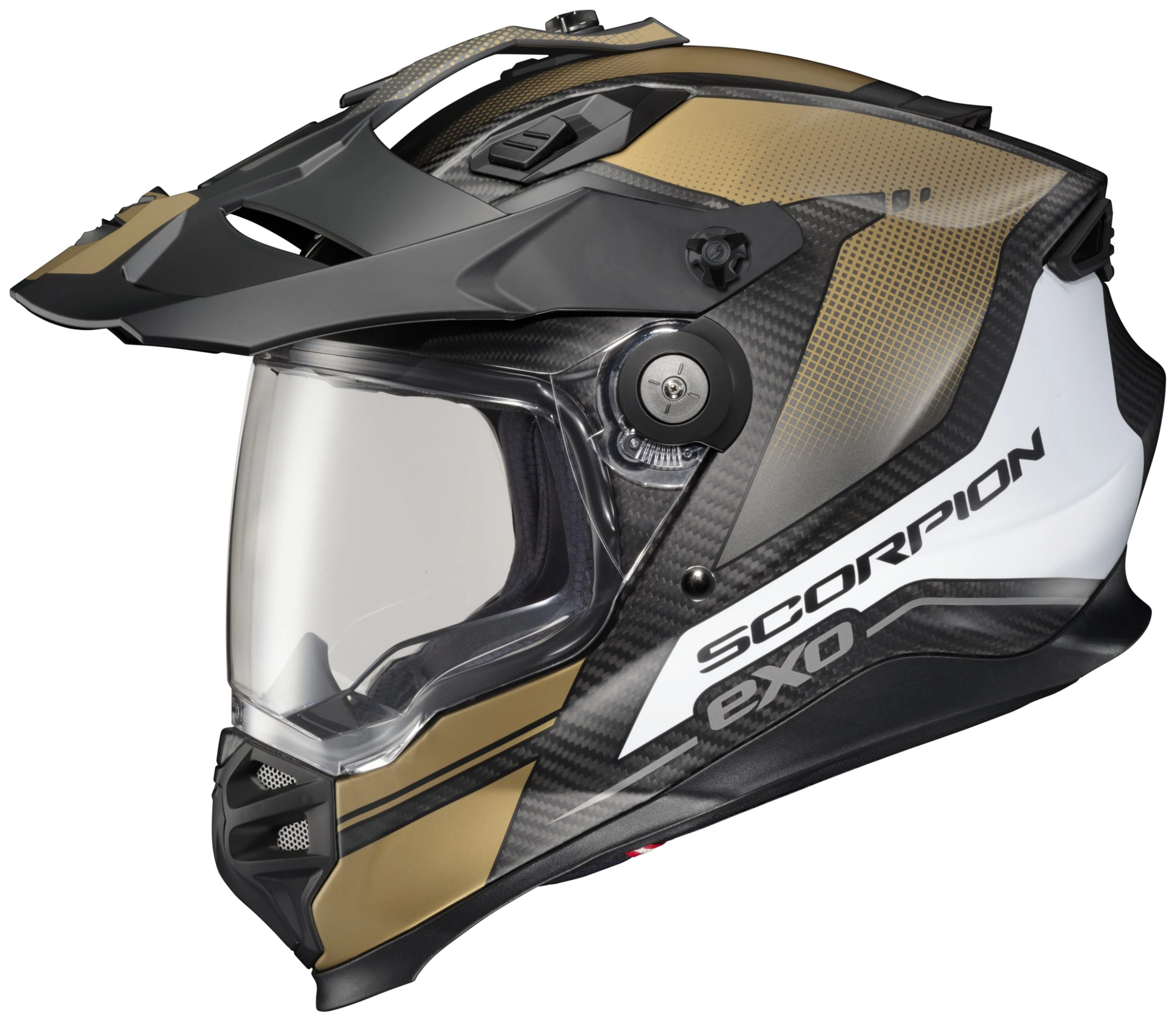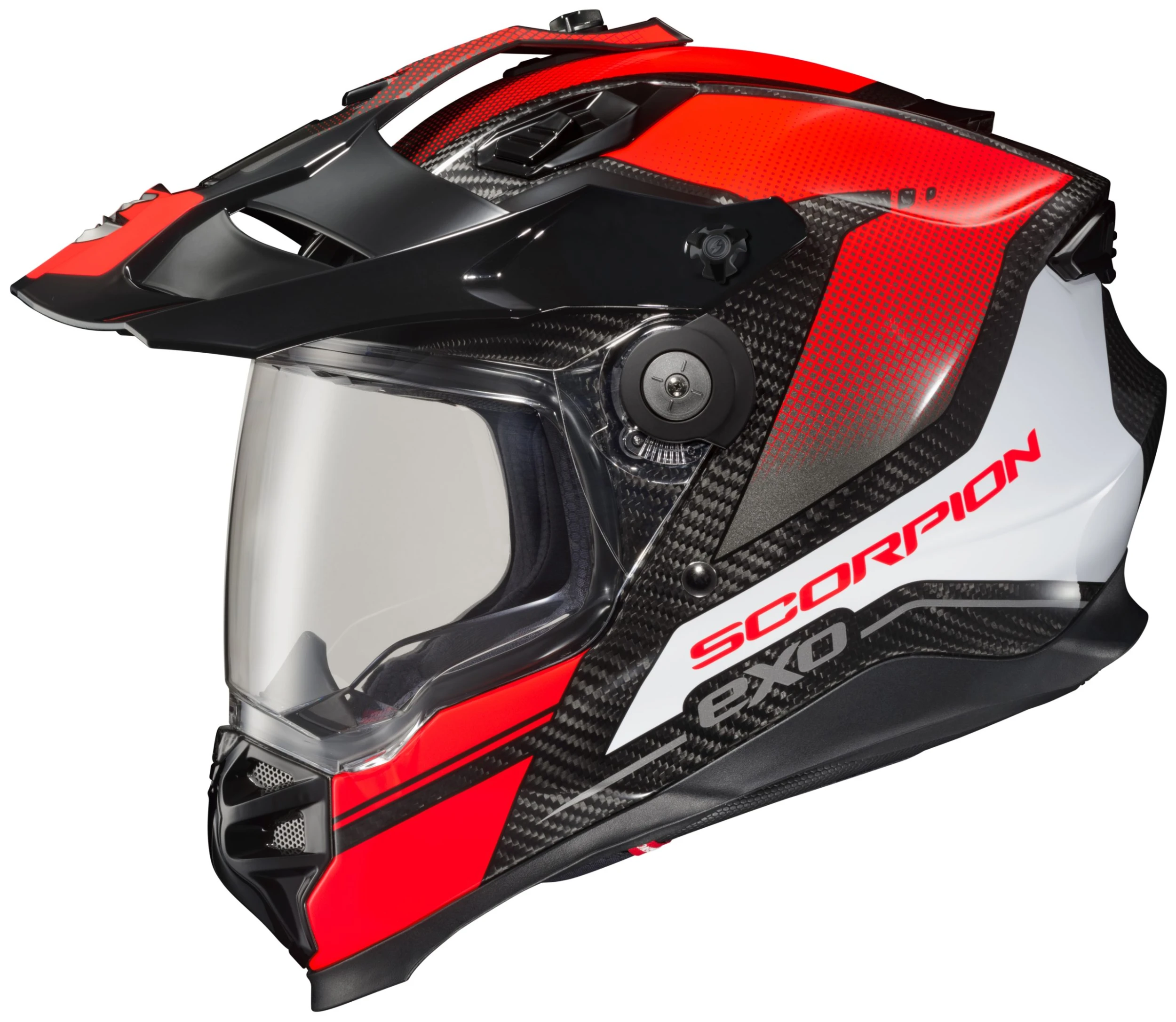 The Scorpion EXO-XT9000 Helmet was engineered to meet the demands of the serious Adventure Rider by striking the perfect balance of features and benefits for both on and off-road. Each helmet is carefully hand crafted using the latest 3K Carbon fiber material, providing superior strength and extreme light weight. The peaks aerodynamics were designed to help keep buffeting and lift to a minimum when riding at high speeds. If the highway is your primary terrain, or if you’re riding away from the sun, the peak visor can be easily removed to allow an even more streamline aerodynamic profile. When adventures take you off-road where goggles are preferred, the face shield features a tool-less system allowing you to easily and quickly swap your shield for goggles. The wide eye port allows for greater peripheral vision and accommodates most sizes and brands of goggles. Another unique feature only seen in Scorpion EXO helmets is the Airfit liner inflation system, which allows you to customize the fit of your cheek pads, which also helps significantly reduce wind noise, buffeting and lift. Whether you’re traveling the globe or riding casually, the XT9000 Carbon was built to provide you with the comfort, safety and confidence needed to take on any terrain; making it a true All-Road, All-Weather helmet.